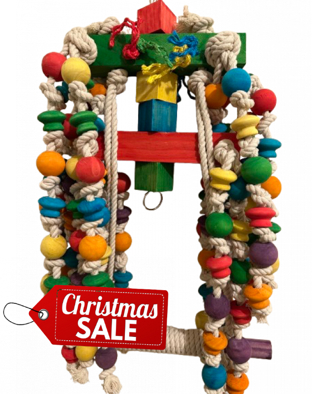 This large toy is full of lots of colourful wooden blocks and shapes, and loads of natural rope for your bird to chew and unravel, this toy will provide your birds with loads of fun.