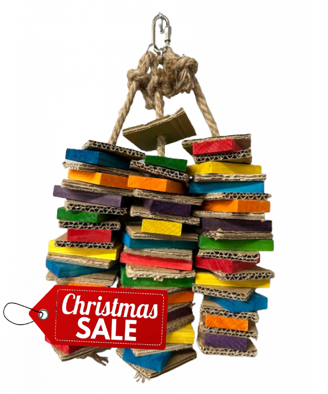 Threaded and stacked high, a Parrot can enjoy chewing away at all the coloured wood and corrugated cardboard slices to keep their beak healthy and trim.