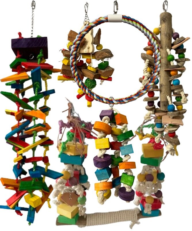 This collection of 6 large parrot toys will keep the Largest Of parrots amused and occupied for weeks with plenty of colorful blocks and rope to chew, its a great bundle of toys and a must have for any cage, our blue and gold macaws and African greys love them, RRP £138.94