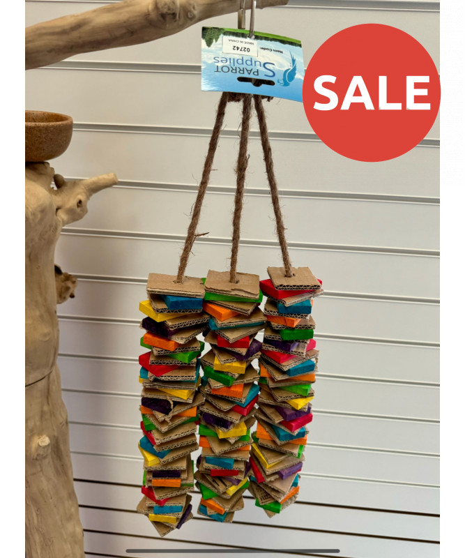 Threaded and stacked high, a Parrot can enjoy chewing away at all the coloured wood and corrugated cardboard slices to keep their beak healthy and trim.