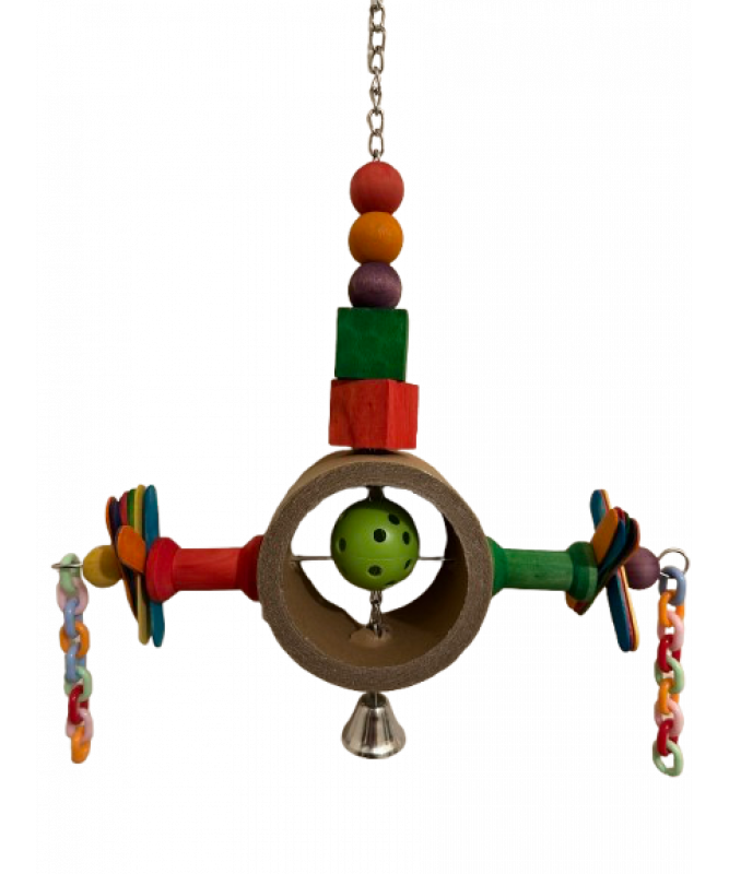 Chunky bagel with plastic balls, lollipop sticks, wooden coloured blocks, wooden coloured balls, plastic chain on either side and a bell.