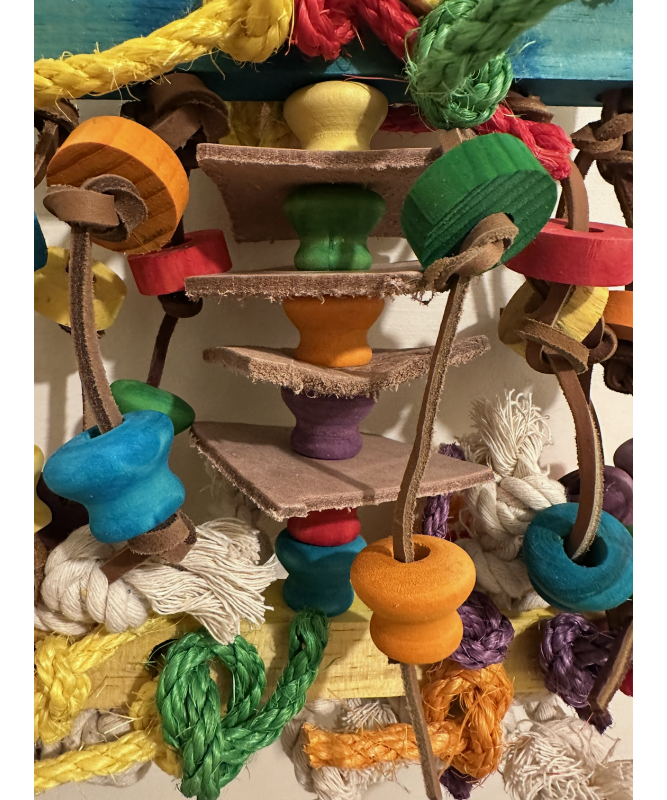 Can your bird tame the Sisal Invader Parrot Toy. At either end is a stack of coloured wooden blocks and leather slices, beyond which lie an assortment of coloured sisal rope for your bird to wrestle with.