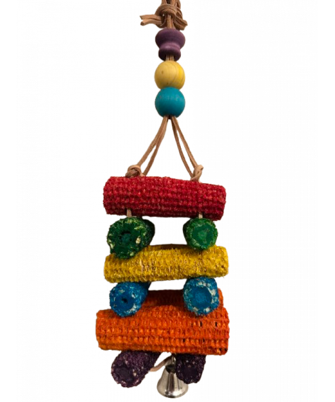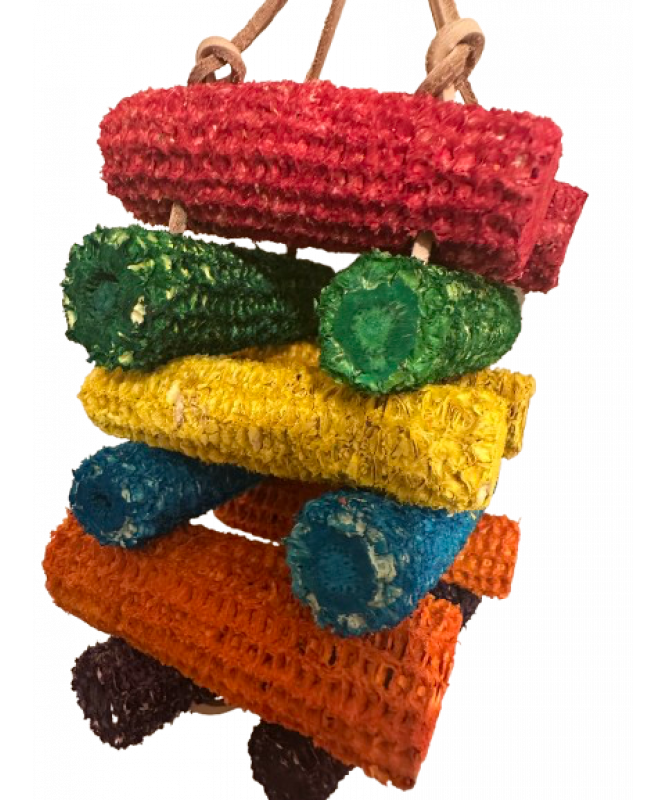 This toy has 12 large corn on the cobs all threaded through leather strands, this Parrot Toy offers hours of shredding fun with a shiny bell at the bottom.