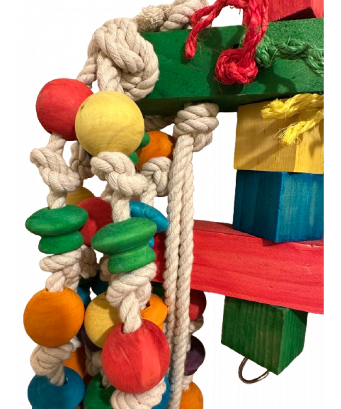 This large toy is full of lots of colourful wooden blocks and shapes, and loads of natural rope for your bird to chew and unravel, this toy will provide your birds with loads of fun.